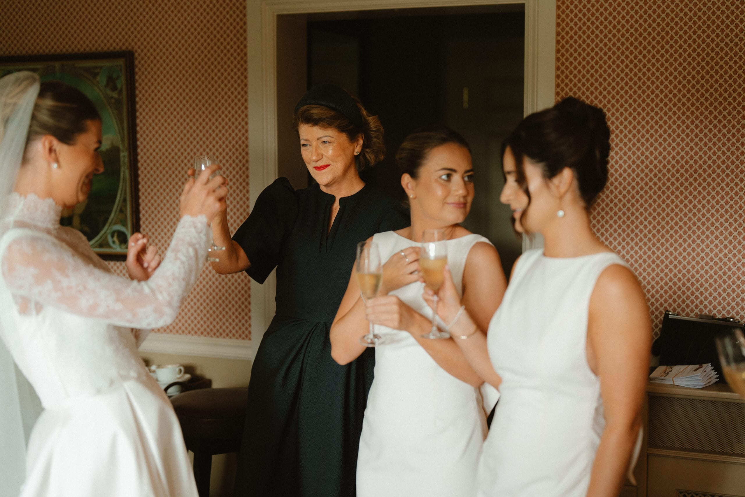 The day began within the walls of Ballynahinch Castle itself, with Megan and Will preparing in two rooms steps apart. Yet the atmosphere in each could not have been more different. Megan’s room was a picture of calm glam, soft light, laughter, and a serene energy as she and her bridesmaids got ready.